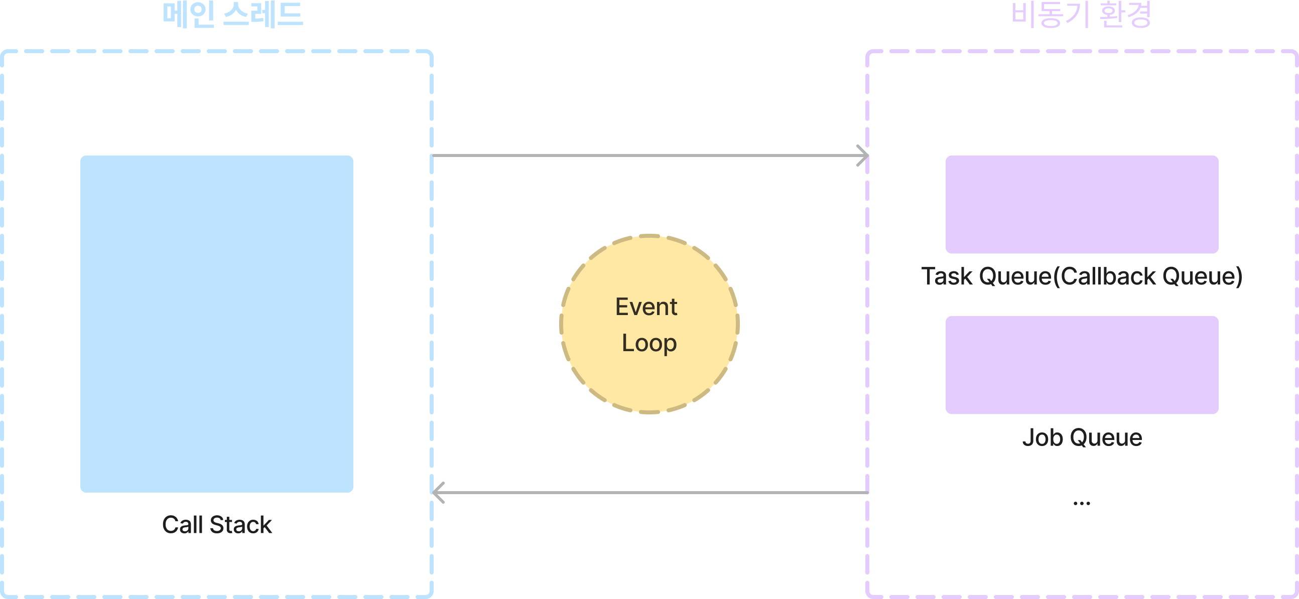 이벤트 루프는 다음의 2가지 조건이 충족될 때, 태스크 큐(콜백 큐)에 있는 함수들을 콜 스택으로 순서대로 이동시켜 해당 함수가 호출되도록 한다.