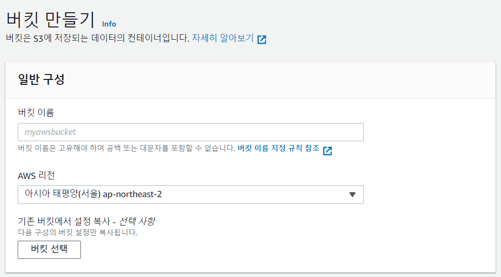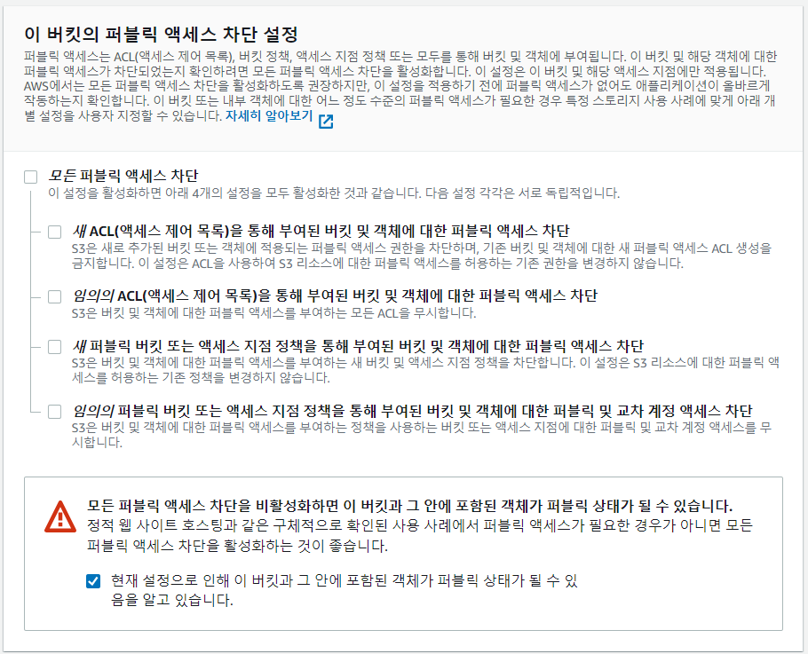 버킷 만들기에 들어가면, 버킷 이름 및 AWS 리전 선택 그리고 이 버킷의 퍼블릭 엑세스 차단 설정을 할 수 있는 화면이 나온다. 여기서 적절한 이름과 지역을 선택하고, 모든 퍼블릭 엑세스 차단을 해제하였다.