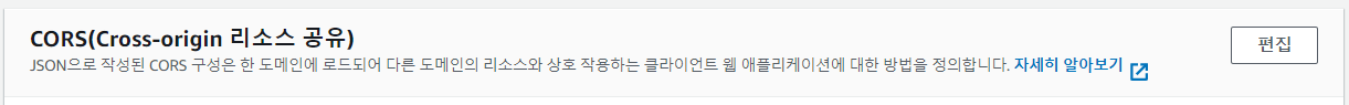 위의 버킷을 클릭하여 들어가면, 상단에 아래와 같이 나온다. 그 중 권한 탭을 선택하여 버킷 정책과 CORS 정책을 다음과 같이 수정하여 저장한다.
