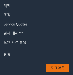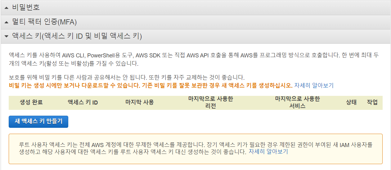 오른쪽 상단의 내 계정을 누르면 보이는 화면에서 보안 자격 증명을 선택한다. 그리고 액세스 키 탭에서 새 액세스 키 만들기를 선택한다. 이 때 액세스 키 ID와 보안 액세스 키 2가지가 나오는데, 보안 액세스 키는 발급 당시만 확인 가능하기 때문에 필히 복사 저장해두어야 한다.