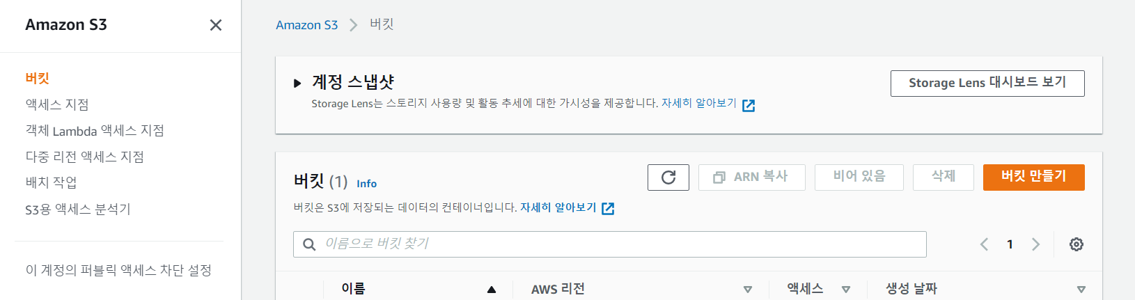 Amazon S3를 들어가면 보이는 화면이다. 여기서 오른쪽에 보이는 버킷 만들기 버튼을 클릭한다.