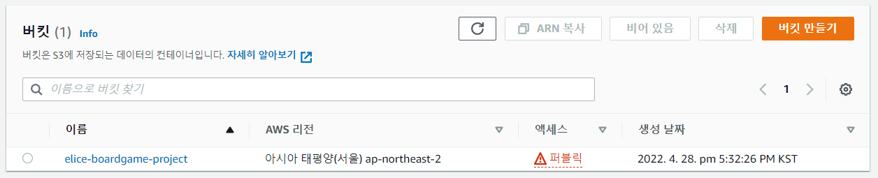 내가 생성한 버킷은 다음과 같이 확인할 수 있다.