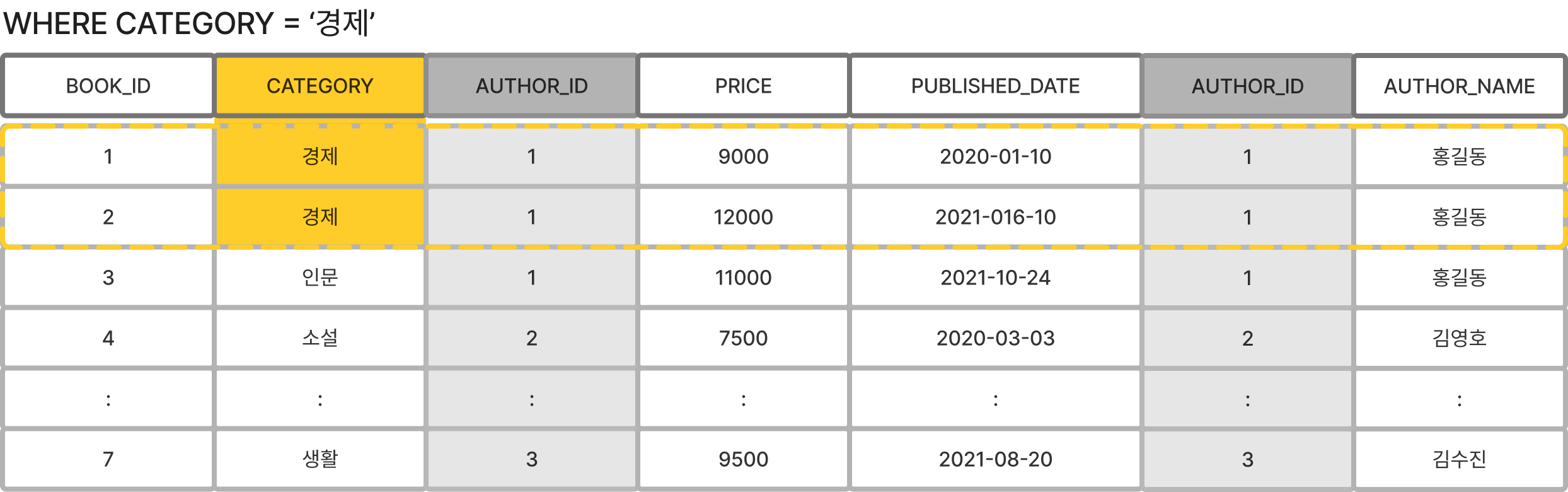 - '경제' 카테고리에 속하는 도서만 뽑기 위하여 WHERE 조건을 건다.