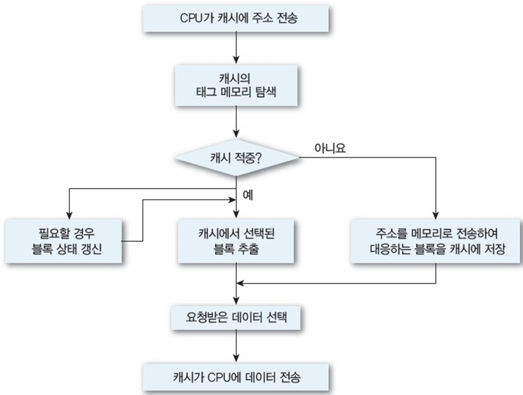 CPU와 메모리 사이의 속도 차이를 줄이기 위한 고속 메모리이다. CPU가 주기억장치에서 저장된 데이터를 읽어올 때, 자주 사용하는 데이터를 캐시 메모리에 저장한 뒤, 다음에 이용할 때 주기억장치가 아닌 캐시 메모리에서 먼저 가져오면서 속도를 향상시킨다.