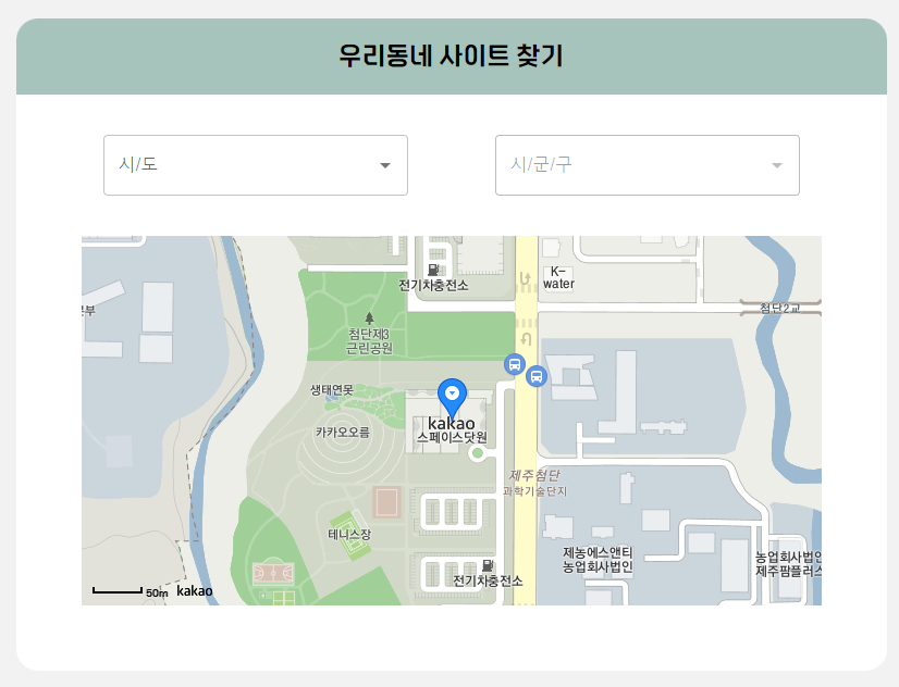 Map.js를 가져와 뿌려줄 화면이다. 참고로 임포트 한 Search에는 MUI 셀렉트 박스만 구현되어 있다.